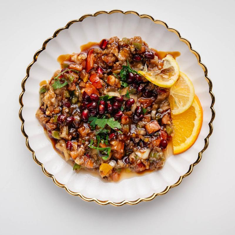 eggplant, bell paper, pomegranate, onion, lemon, garlic and tomato